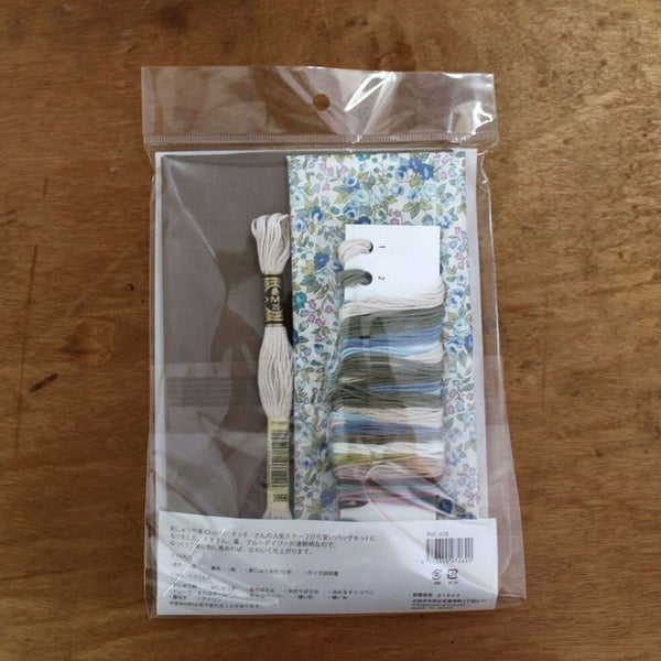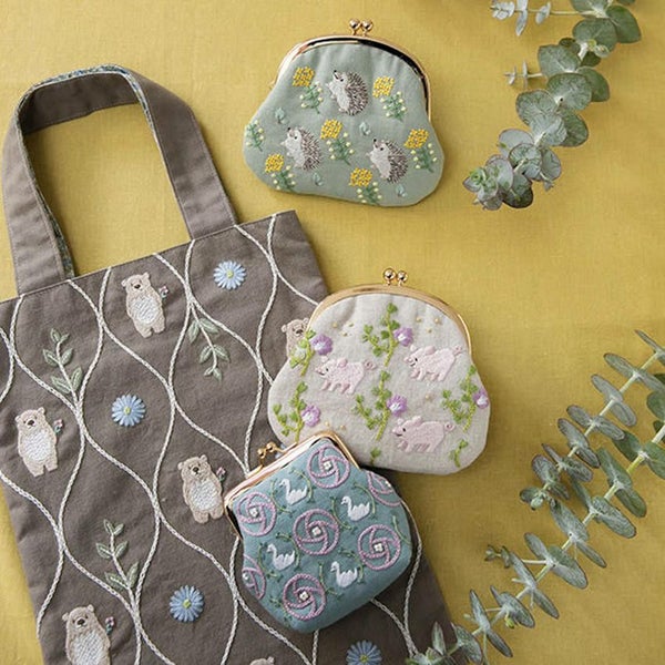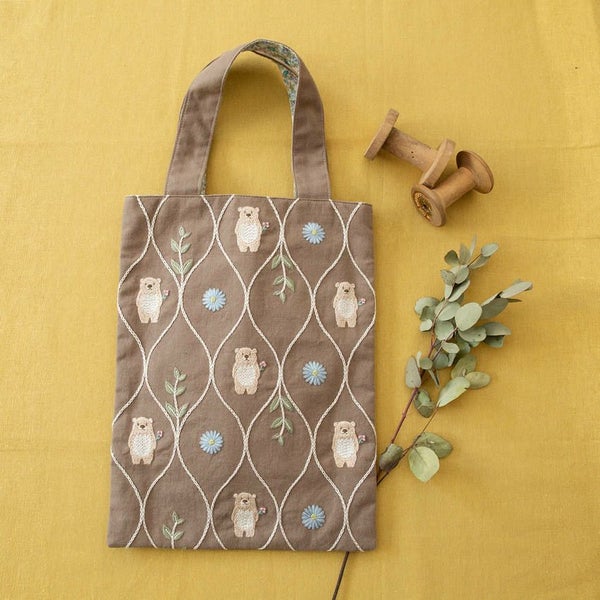 刺しゅう作家 Chicchi -チッチ -さんの人気モチーフが可愛いバッグキットになりました。くまさん、葉、ブルーデイジーの連続柄なので、
