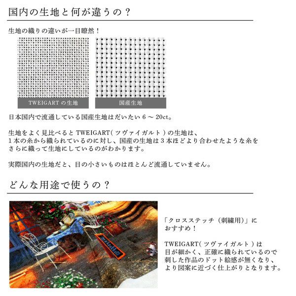 国産の生地と比べると目が細かく、クロスステッチに最適です。