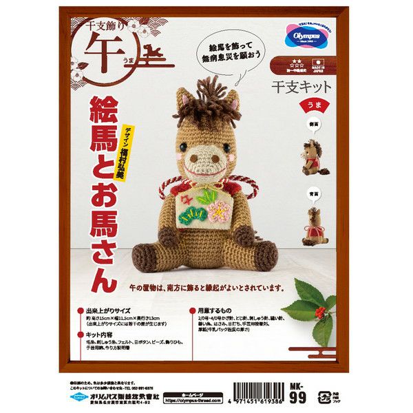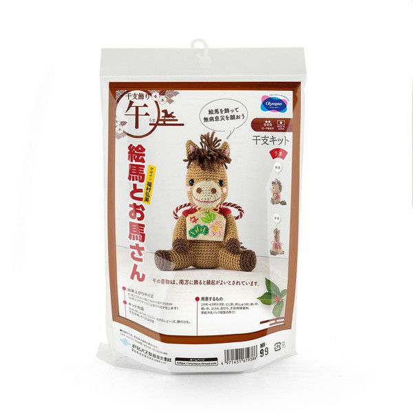 毛糸(ウール60% アクリル40%)、刺しゅう糸 (綿100%)、フェルト(ポリエステル100%)、手芸用綿(ポリエステル100%)、目ボタン(ユリヤ樹脂)・ビーズ(ガラス)、飾りひも:紅白(レーヨン100%)、飾りひも:金(ポリエステル100%)