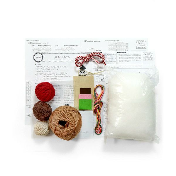 毛糸、刺しゅう糸、フェルト、目ボタン、ビーズ、飾りひも、手芸用綿、作り方説明書