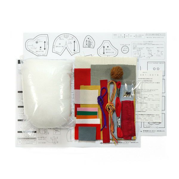 表布(綿100%)、ちりめん(レーヨン100%)、フェルト(ポリエステル100%)、毛糸(ウール80%・アルパカ20%)、手芸用綿 (ポリエステル100%) 、飾りひも(レーヨン100%)、