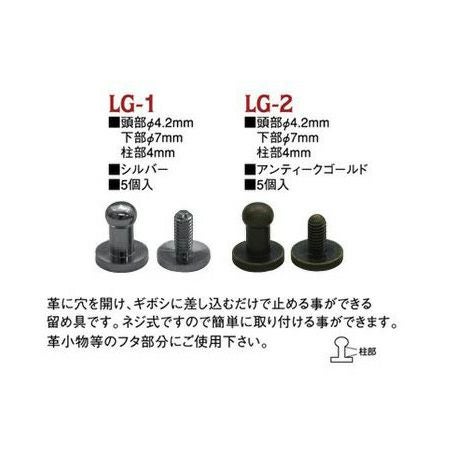革に穴をあけ、ギボシに差し込むだけで留めることができる留め具です。ねじ式ですので簡単に取り付ける事が出来ます。