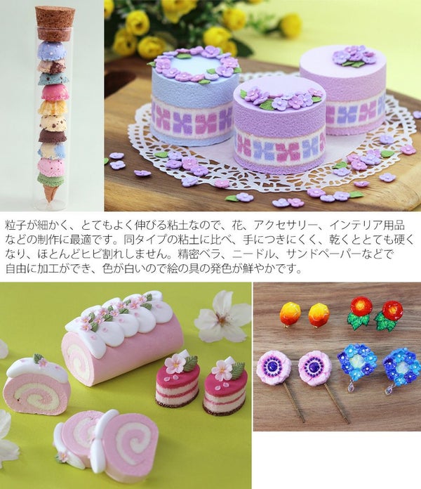 新素材使用焼却時に有毒ガスがでません。とても軽いので持ち運びが大変楽です。また、作品が乾くまで支えや芯材を必要とした部分もかんたんに制作できます。粒子が細かくとてもよく伸びるので、花、アクセサリー、インテリア用品などの制作に最適です。同タイプの粘土に比べ、手に付きにくく、乾くととても硬くなりほとんどひび割れしません。精密ベラ、ニードル、サンドペーパーなどで自由に加工できます。色が白いので絵の具の発色が鮮やかです。