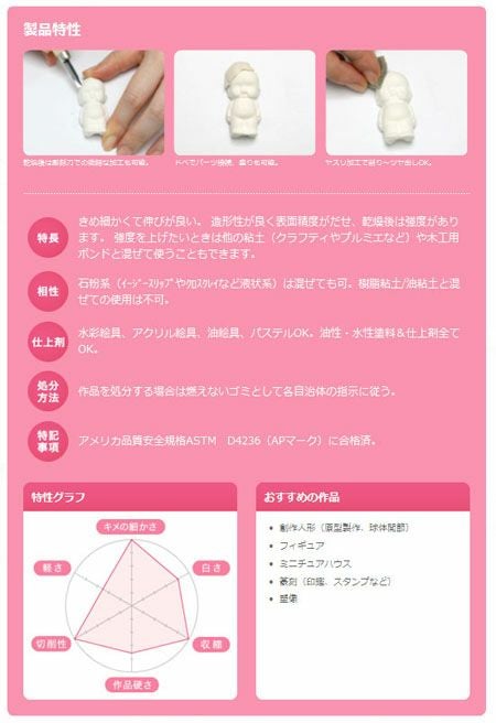 きめ細かくて伸びがいい石粉の粘土。表面仕上げに最も適した石塑粘土です。乾燥後は強度があります。篆刻、彫塑、フィギュア、ジオラマなどあらゆる造型表現に対応。アメリカ品質安全規格ATSM D4236(APマーク)に合格済み。