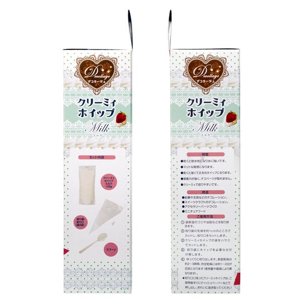内容物:クリーミィホイップ、絞り袋×2枚、絞り口(星6切)、スプーン