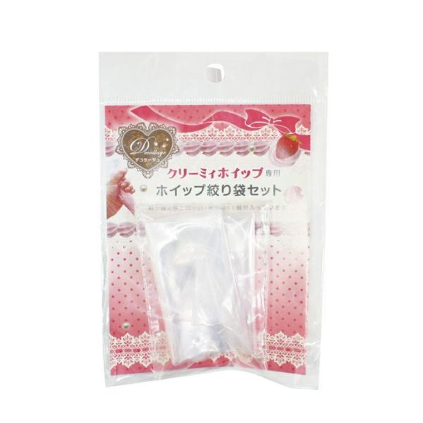 絞り袋2枚と絞り口1個がセットになった、クリーミィホイップ専用のホイップ絞り袋セットです。