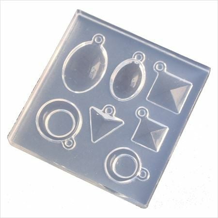 楕円形、四角形、リング形、三角形型が1つのモールドに。レジンや粘土を入れて固めて簡単にチャームパーツが作れます。