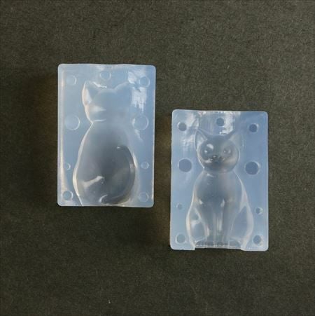 立体の猫シリコーン製型抜きです。表面と後ろ面を合わせ立体のお座り猫ちゃんが作れます。