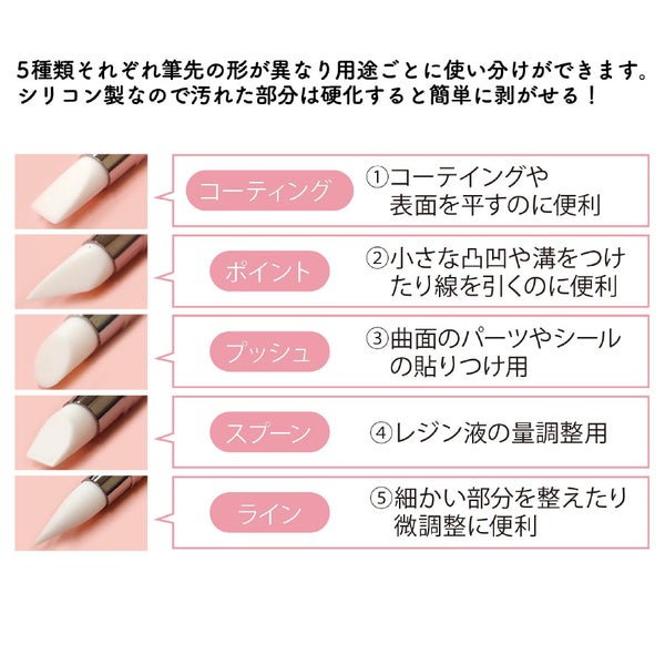 5種類それぞれ筆先の形が異なり、用途ごとに使い分けができます。