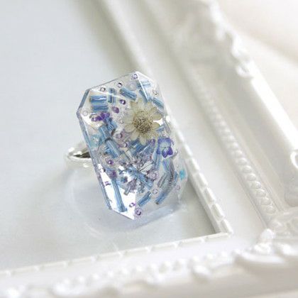 レジンの中に入れたり、外側に貼ったりすることができます。外側に貼る場合は包み込むように上からレジンを縫って硬化させてください。