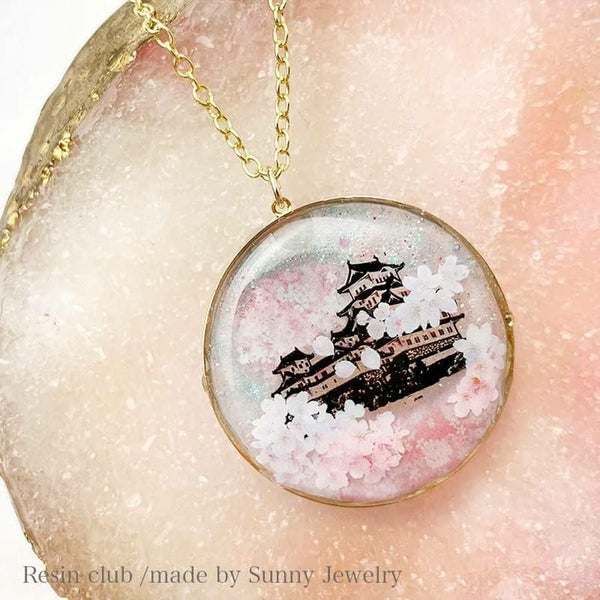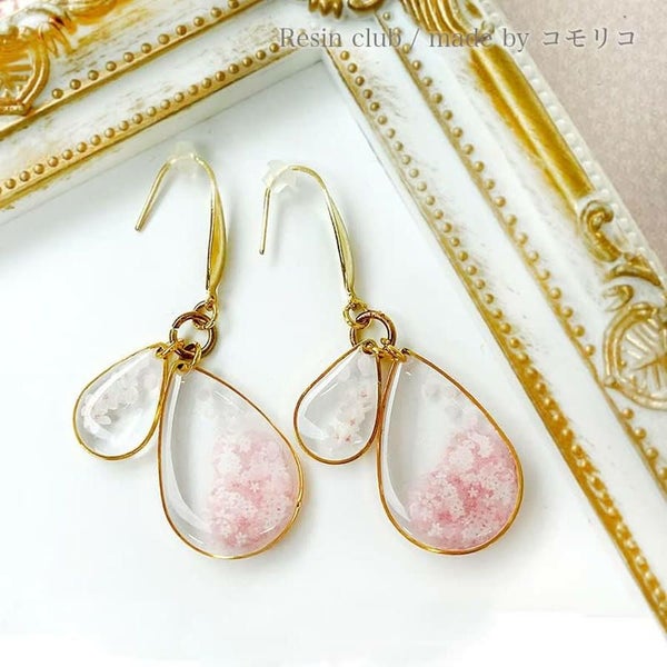 レジンの中に満開の桜が咲くように小さな桜の花を集めて一枚のシートに。桜が霞むような模様と花を合わせて使えば奥行き感のある風景が作れます。