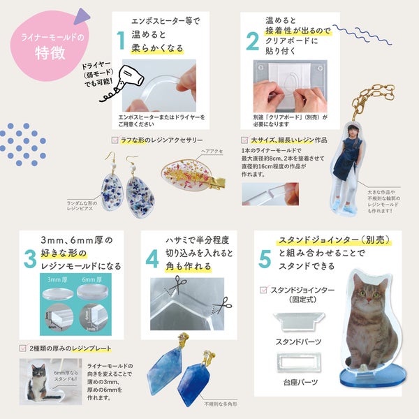クリアボード(別売り)に貼り付けて自由に好きな形のレジンプレート(3mm厚または6mm厚)が 作れるモールドです。