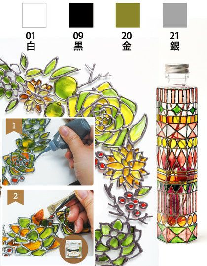 ガラスペイントライナーはガラス面に線を描くことができるペイントです。ガラスペイントと組み合わせることでステンドグラス風の仕上げができます。カラーバリエーションは金・銀・白・黒の4色です。タイルやプラスチック、木、紙などにも描けます。