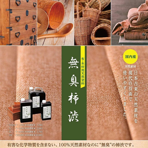 ・無臭柿渋は、天然物から製造しております。柿渋の大きな欠点として、独特の強い臭いがあります。この臭いを解消するために成分の分子量の大きさの違いに着目。分子量の大きいタンニンはそのまま残し、分子量が小さく臭いの元となるタンニン以外の成分を分離して取り除きました。この先進技術により柿渋の効果はそのままに、全く臭わない「無臭柿渋」が誕生しました。【木材に塗る場合】【布を染める場合】と2つの用途がございます。