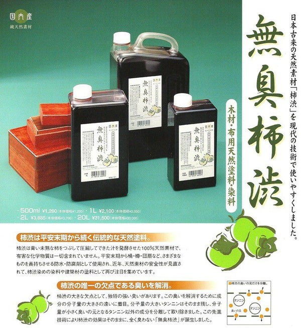 ・無臭柿渋は、天然物から製造しております。柿渋の大きな欠点として、独特の強い臭いがあります。この臭いを解消するために成分の分子量の大きさの違いに着目。分子量の大きいタンニンはそのまま残し、分子量が小さく臭いの元となるタンニン以外の成分を分離して取り除きました。この先進技術により柿渋の効果はそのままに、全く臭わない「無臭柿渋」が誕生しました。【木材に塗る場合】【布を染める場合】と2つの用途がございます。