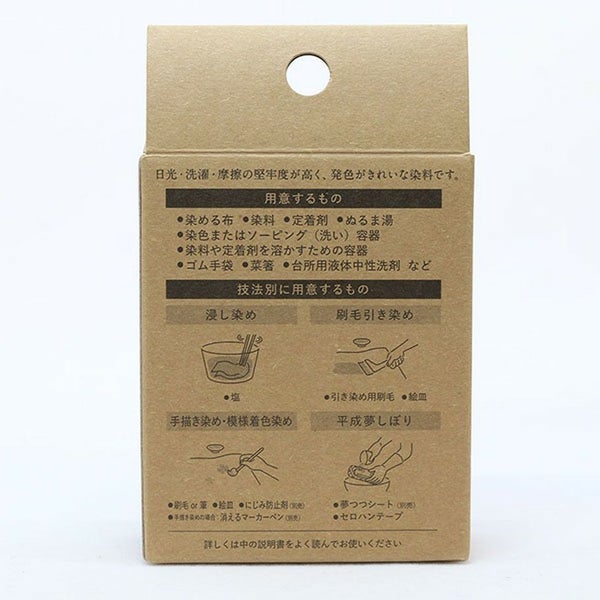 鮮やかな発色で浸し染め・ろうけつ染め・しぼり染め・刷毛引き染め・手描き染め・模様着色染め・平成夢しぼり(みやこ染オリジナル)と様々な技法が楽しめる染料です。40~60℃で手軽に染められるます。
