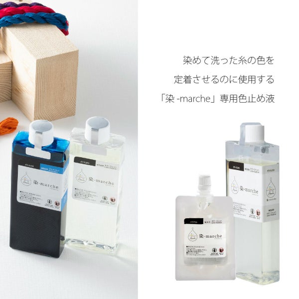 染めて洗った糸の色を定着させるのに使用する「染-marche」専用色止め液。使い終わったら小さく畳んで処分できるエコなパウチタイプ。