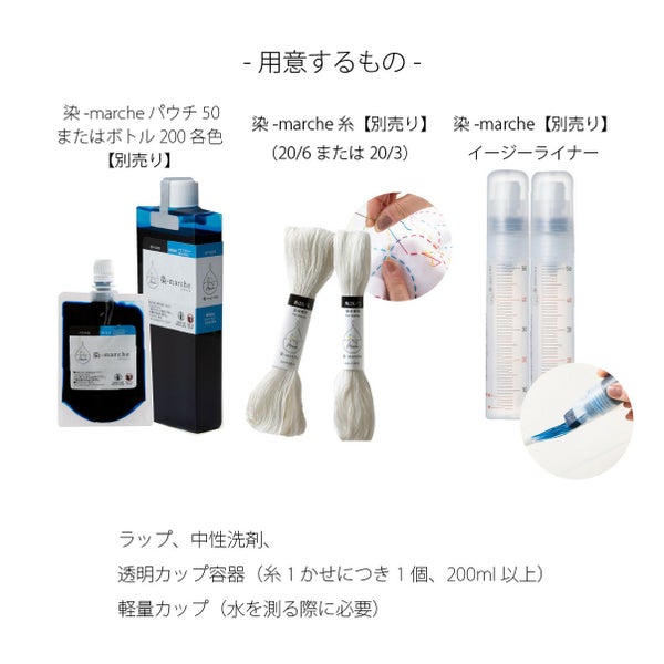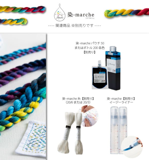 染-marche パウチ50またはボトル200各色、染-marche 糸(20/6または20/3)、染-marche イージーライナー、ラップ、