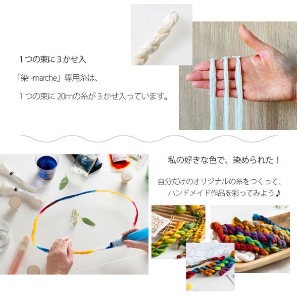 液体染料(チェリーレッド、アクアブルー、ムーンイエロー)各10ml、カラーフィット(色止め液)10ml、染-marche 糸20/6 3かせ、染-marche イージーライナー 3本、作り方説明書