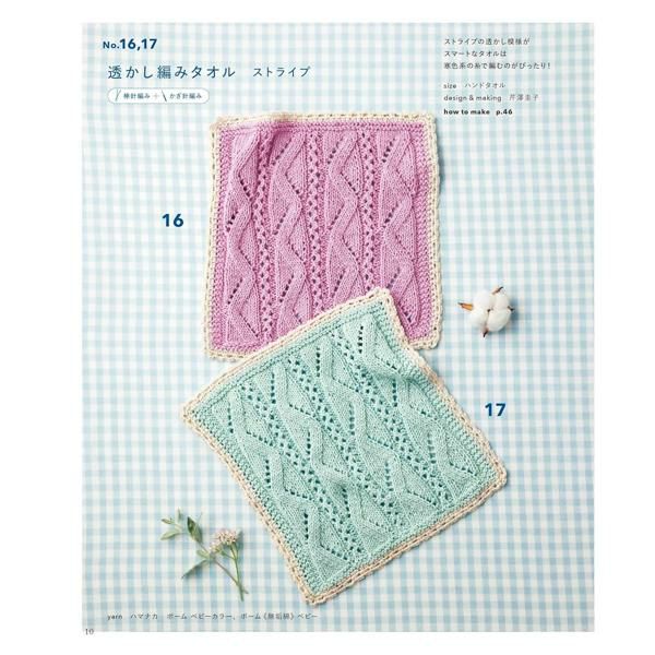 かぎ針編みと棒針編みのニットタオルの作品集。シンプルなこま編みやメリヤス編み、