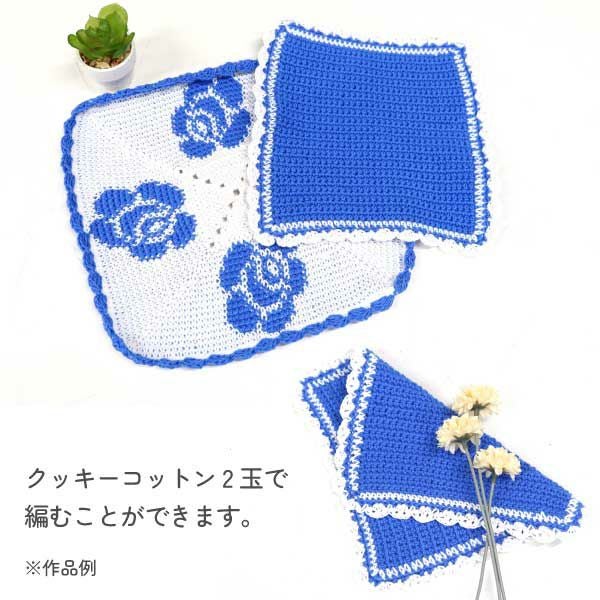 コットン糸で編むのでお肌に優しく吸水性に優れて実用的な上、平らに簡単に編めるので編み物初心者さんにもおすすめ。