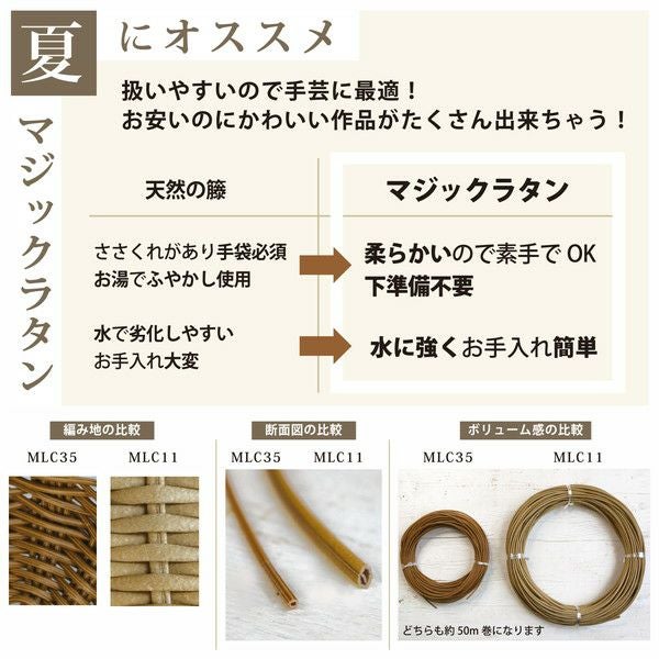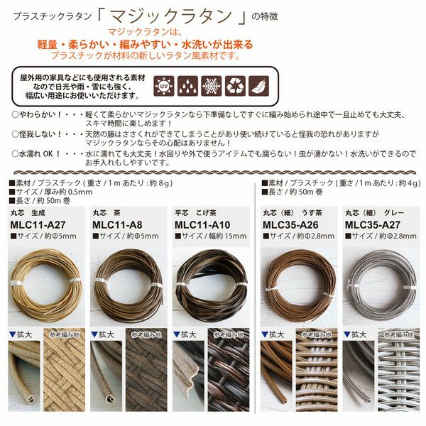 マジックラタンは、軽量・柔らかい・編みやすい・水洗いが出来る、プラスチックが材料の新しいラタン風素材です。