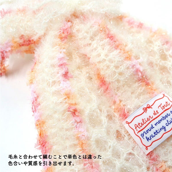 いつもの毛糸と一緒に編むだけで、色の重なりやふんわりした質感が加わり、作品の雰囲気がぐっと華やかになります。