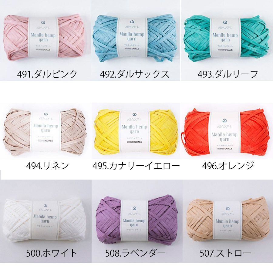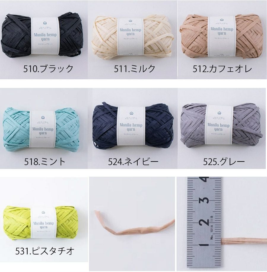 他の画像を見る ME-500-531 (お取り寄せ)マニラヘンプヤーン 3玉単位 50m巻 編み糸 マニラ麻100% 編糸 メルヘンアート 27色 洗濯できる 軽くて柔らかい 夏 編み糸 編み物 帽子 バック カゴ マニラ麻100% ¥ 1,738 税込 お気に入りに登録する