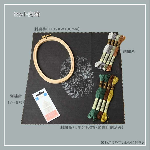 図案はリネン布にプリント済みなので、初心者の方でもすぐに始める事ができます。完成後はそのまま刺しゅう枠に入れて飾るとかわいいインテリアに。