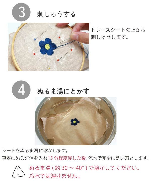 刺しゅうしたあとはぬるま湯で溶かすだけ!!