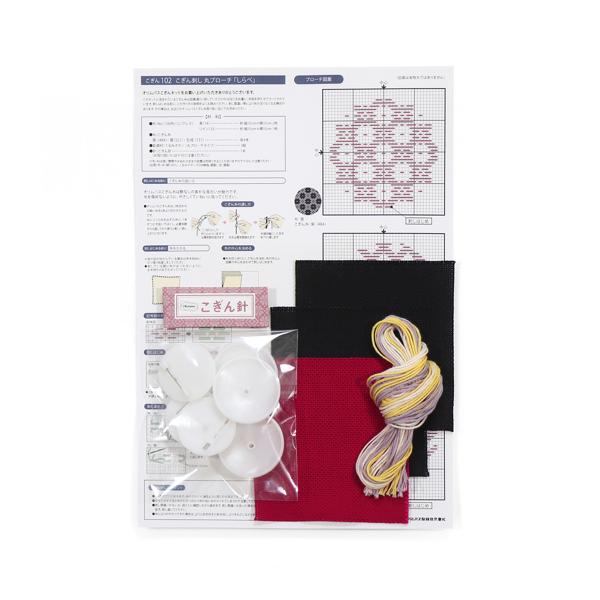 102: No.1100布(コングレス)黒(14)、ワイン(33)、こぎん糸 3色、くるみボタン(丸ブローチタイプ) 3組、こぎん針、カラー図案付説明書