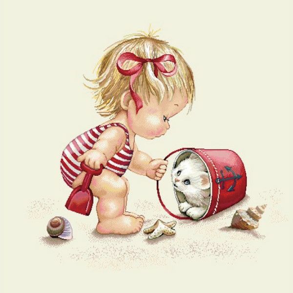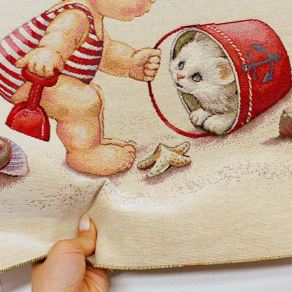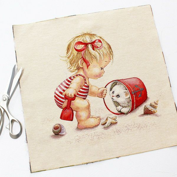 5. ゴブラン織 生地 インテリア パネル 砂浜 女の子とネコ ヨーロッパ輸入 約47×47cm パネル