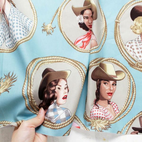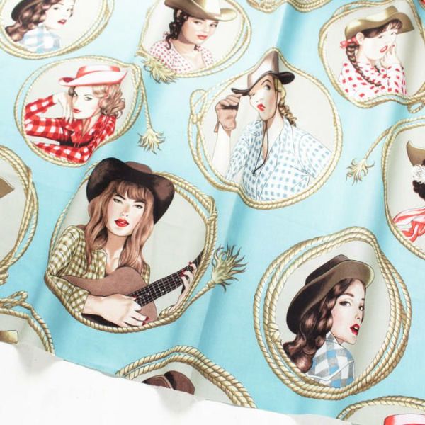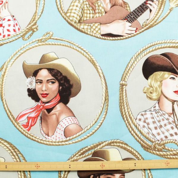 - 生地 輸入生地 アレキサンダー USA生地ブルー地 ベージュ ウエスタンガール ALEXANDER HENRY アレキサンダーヘンリー USAプリント(最低単位30cm~10cm単位の切り売り)