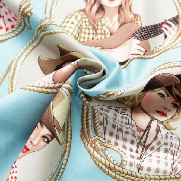 - 生地 輸入生地 アレキサンダー USA生地ブルー地 ベージュ ウエスタンガール ALEXANDER HENRY アレキサンダーヘンリー USAプリント(最低単位30cm~10cm単位の切り売り)