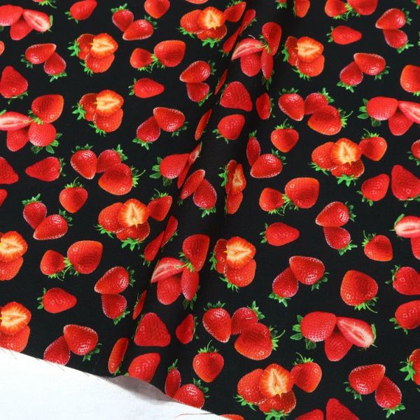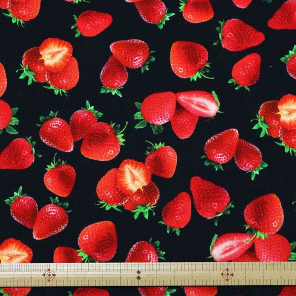 生地 輸入生地 USAプリント生地 ジューシーいちご ブラック地 いちご柄 フルーツ柄 かわいい Treasures タイムレストレジャー STELLA ステラ 巾約110cm (最低単位30cm~10cm単位の切り売り) | 手芸材料のネットショップ つくる楽しみ.com