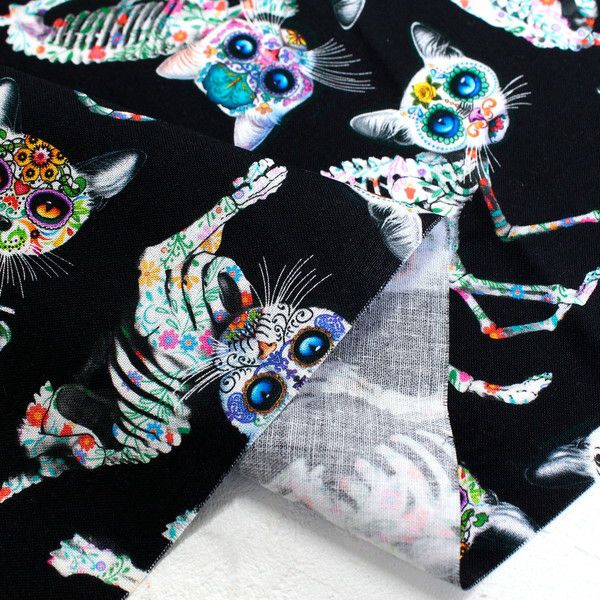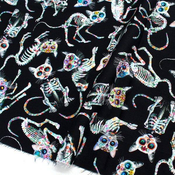 輸入生地 生地 BK地カラフルガイコツ猫全身TimelessTreasures USAプリント (最低単位30cm~10cm単位の切売) | 手芸材料のネットショップ つくる楽しみ.com