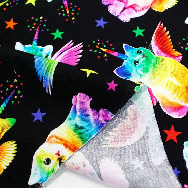 輸入生地 生地 BK地虹色ユニコーン猫TimelessTreasures USAプリント (最低単位30cm~10cm単位の切売) | 手芸材料のネットショップ つくる楽しみ.com