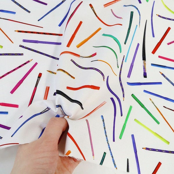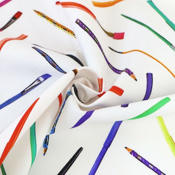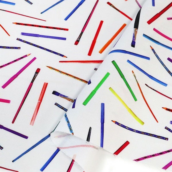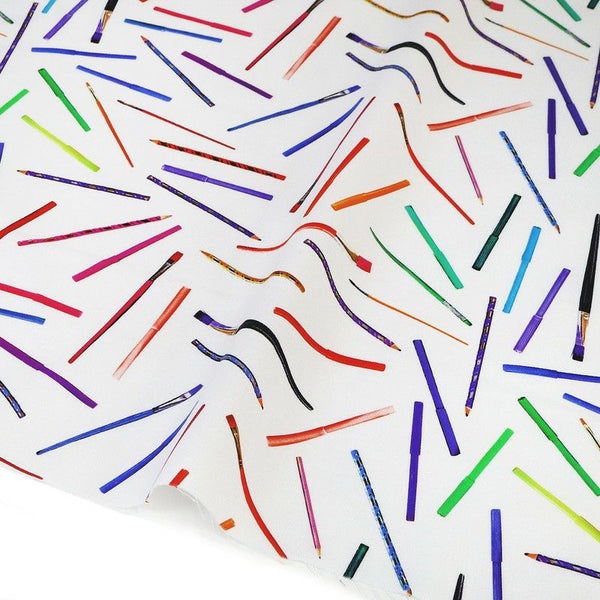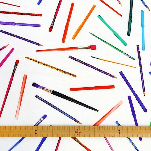 生地 輸入生地 プリント生地 USAプリント ホワイト 鉛筆 筆 マーカーペン ROBERTKAUFMAN ロバートカフマン 巾約110cm (最低単位30cm~10cm単位の切り売り) | 手芸材料のネットショップ つくる楽しみ.com