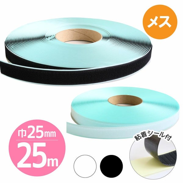 【取寄商品】【徳用25m】マジックテープ(エコマジック)粘着剤付 巾25mmx25m【Bメス】白・黒 面ファスナー ベルクロ 縫い付け 業務用 | 手芸材料のネットショップ つくる楽しみ.com