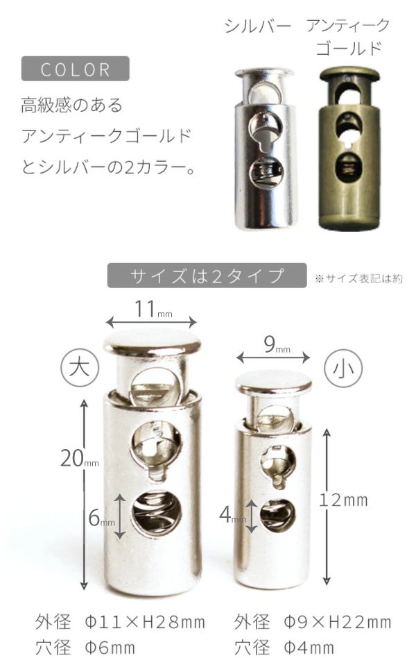 コードストッパー ループストッパー 2つ穴(同色2個入)2サイズ シルバー アンティークゴールド | 手芸材料のネットショップ つくる楽しみ.com