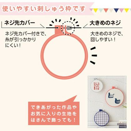 ネジ先カバー付きで糸が引っかかりにくく、大きめのネジで回しやすい、使いやすい刺しゅう枠です。
