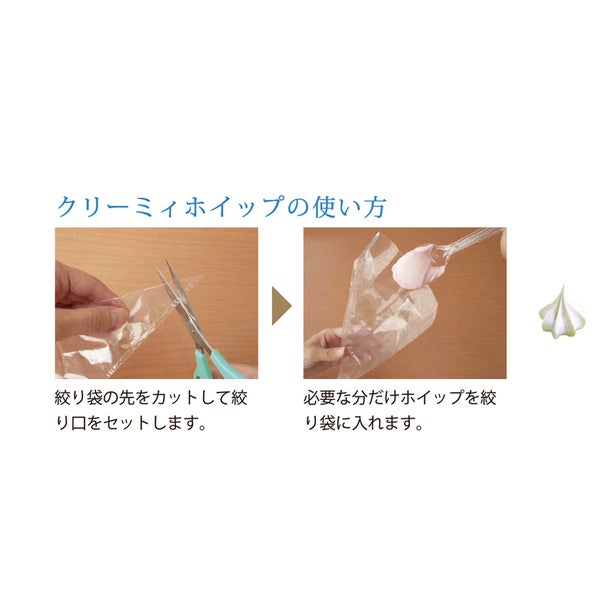 絞り袋2枚と絞り口1個がセットになった、クリーミィホイップ専用のホイップ絞り袋セットです。