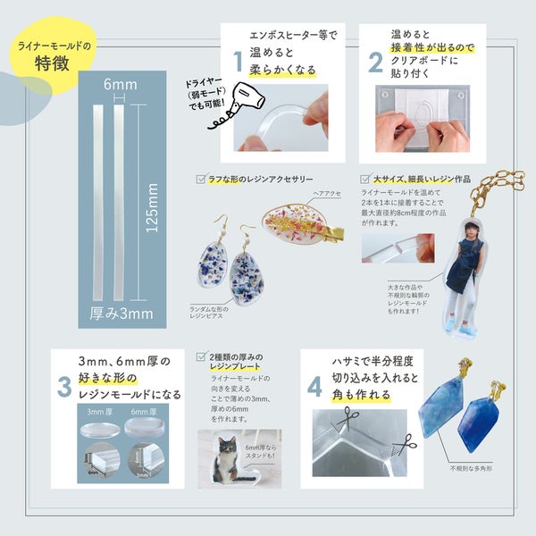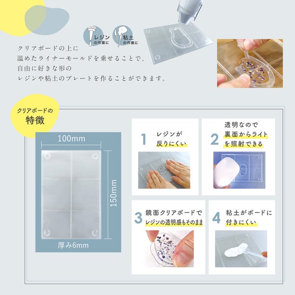 クリアボードの上に温めたライナーモールドを乗せることで、自由に好きな形のレジンプレートを作ることができます。