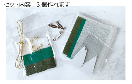 丸つまみでクリスマスツリーブローチが3個作れます。カット済みの一越ちりめんや裏処理用の芯紙がセットされたつまみ細工キット。つまみ細工初心者の方にも始めやすい参考動画が見られるQRコード付き説明書が入っています。