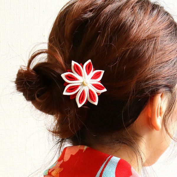 けんつまみの手法でつくる紅白のコサージュクリップです