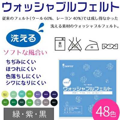 洗える素材のウォッシャブルフェルトです。色落ちしにくく、縮みにくい、しわになりにくい、ほつれにくいといった従来のカラーフェルト(素材:ウール60% レーヨン40%)では出来なかった多機能フェルト素材です。