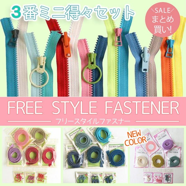 - フリースタイル ファスナー 3番ミニ 得々セット(ファスナー1.2mx5本、スライダー3個x3袋)