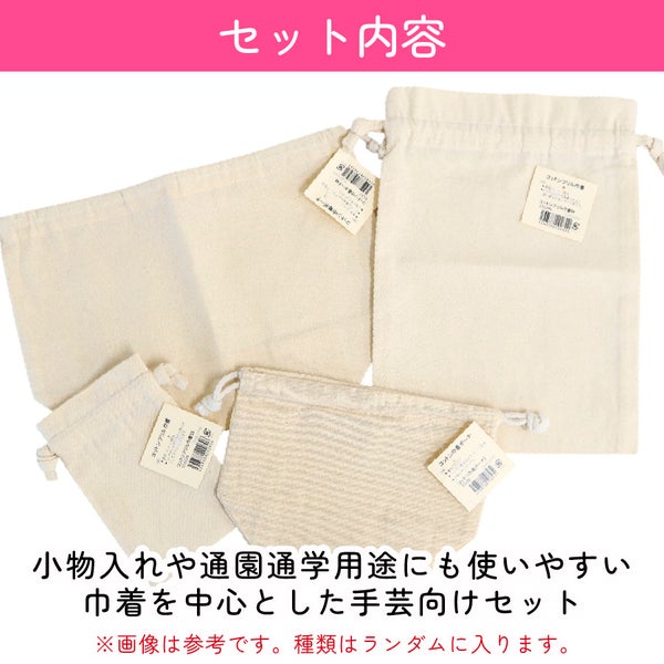 小物入れや通園通学用途にも使いやすい巾着を中心とした手芸向けセットです。