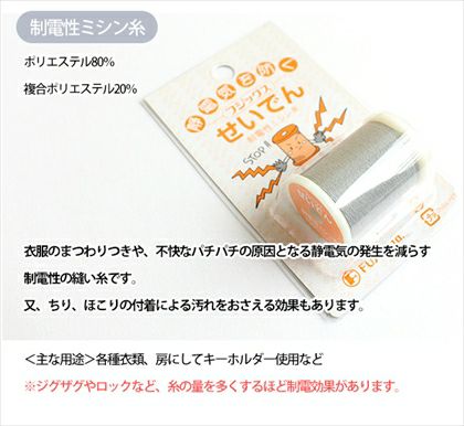 衣服のまとわりつきや、不快なパチパチの原因となる静電気の派生を減らす制電性の縫い糸です。ちり、ほこりの付着による汚れを抑える効果もあり、選択しても効果は変わりません。ジグザグやロックなど、糸の量を多くするほど静電効果があります。