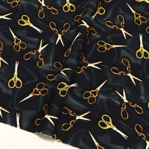 - 生地 輸入生地 USAプリント生地 アンティークはさみ はさみ柄 ブラック地 Treasures タイムレストレジャー STELLA ステラ 巾約110cm (最低単位30cm~10cm単位の切り売り)